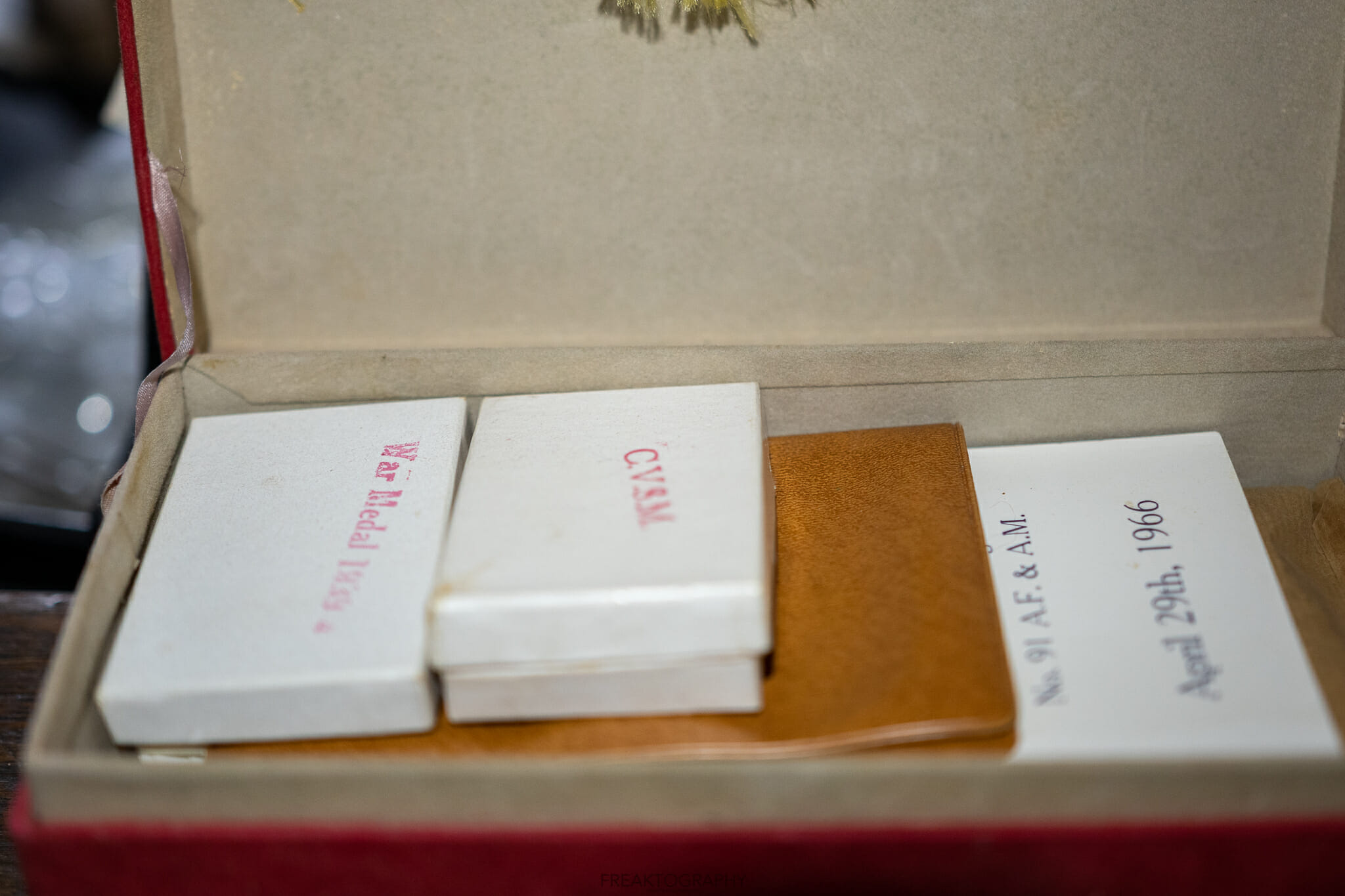 I reach up and bring down the boxes, opening the first one I spot a small white square box with the initials C.V.S.M. and another one that reads “War Medal 1939…” I am immediately aware of what I have found, CVSM means Candadian Volunteer Service Medal and was granted to “Persons of any rank in the Naval, Military or Air Forces of Canada who voluntarily served on Active Service from September 3, 1939, to March 1, 1947”
