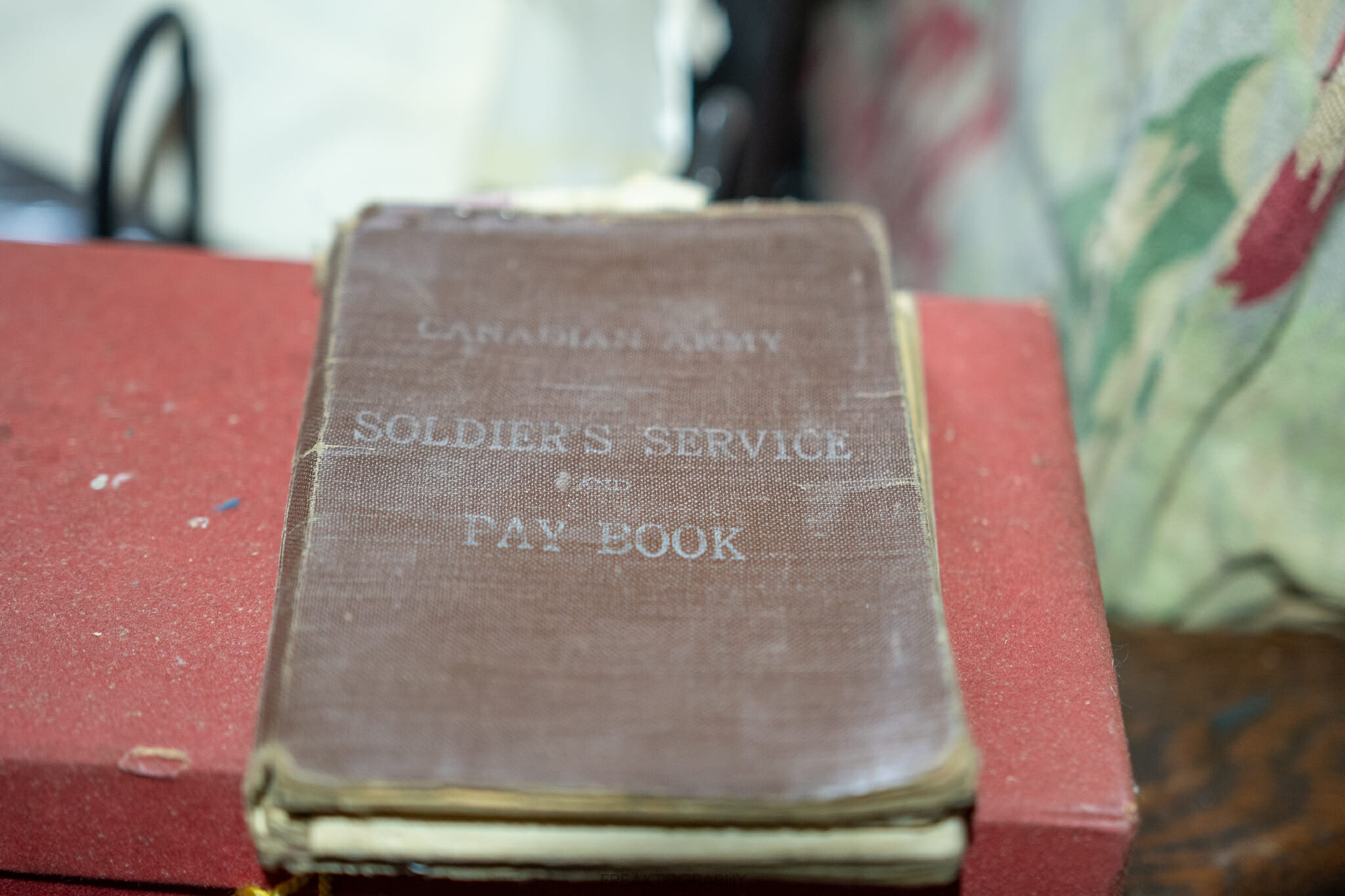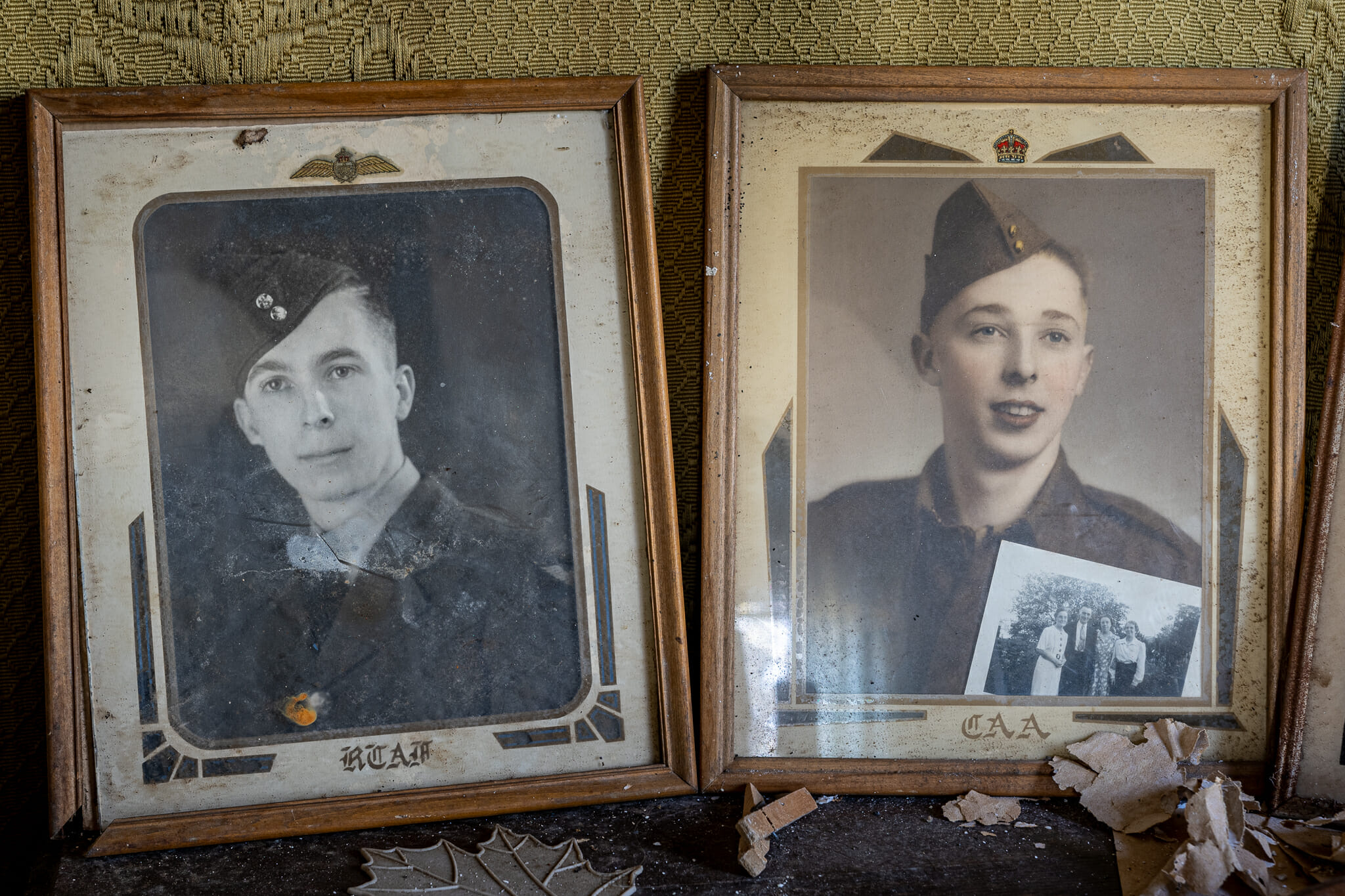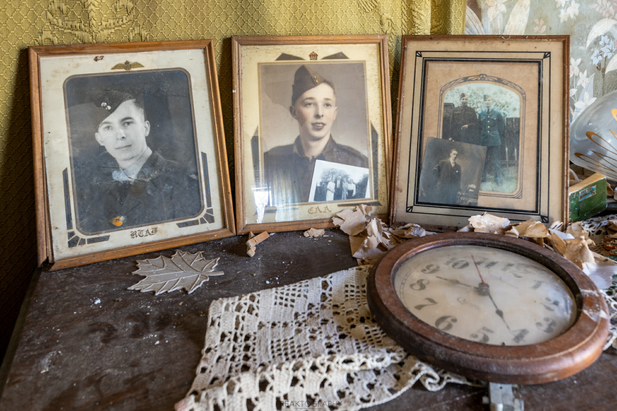On a dresser I spot some old photos, two soldiers, possibly brothers, one served with the Royal Canadian Air Force, obvious by the RCAF on the photo and the other had “CAA” which we have gathered means Canadian Army Active, this man may have been Infantry, then there is a photo of the two young soldiers together.