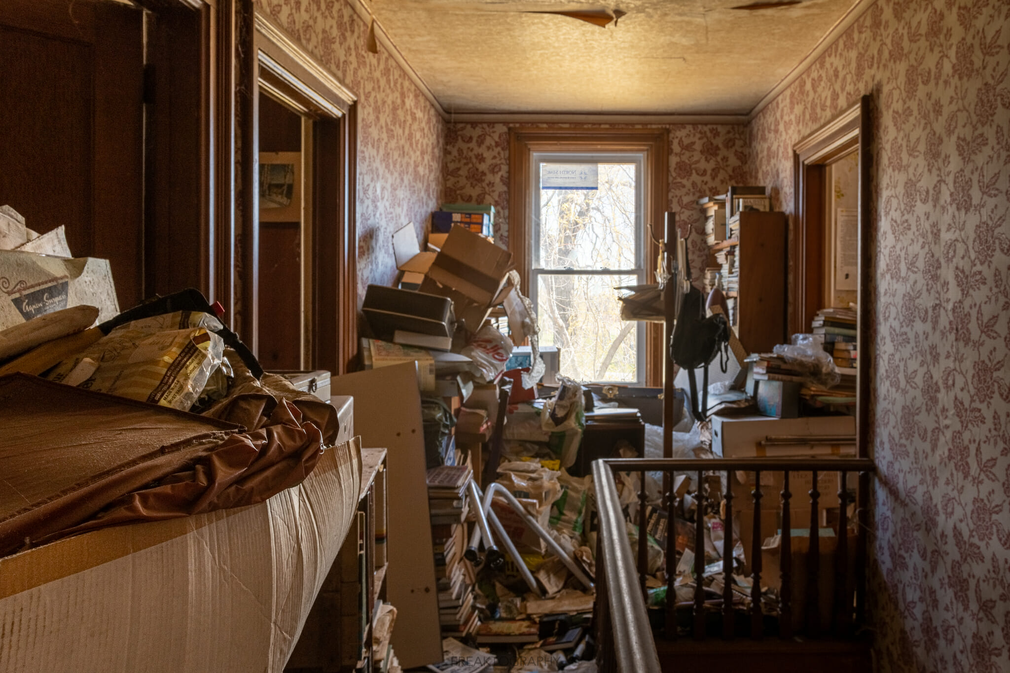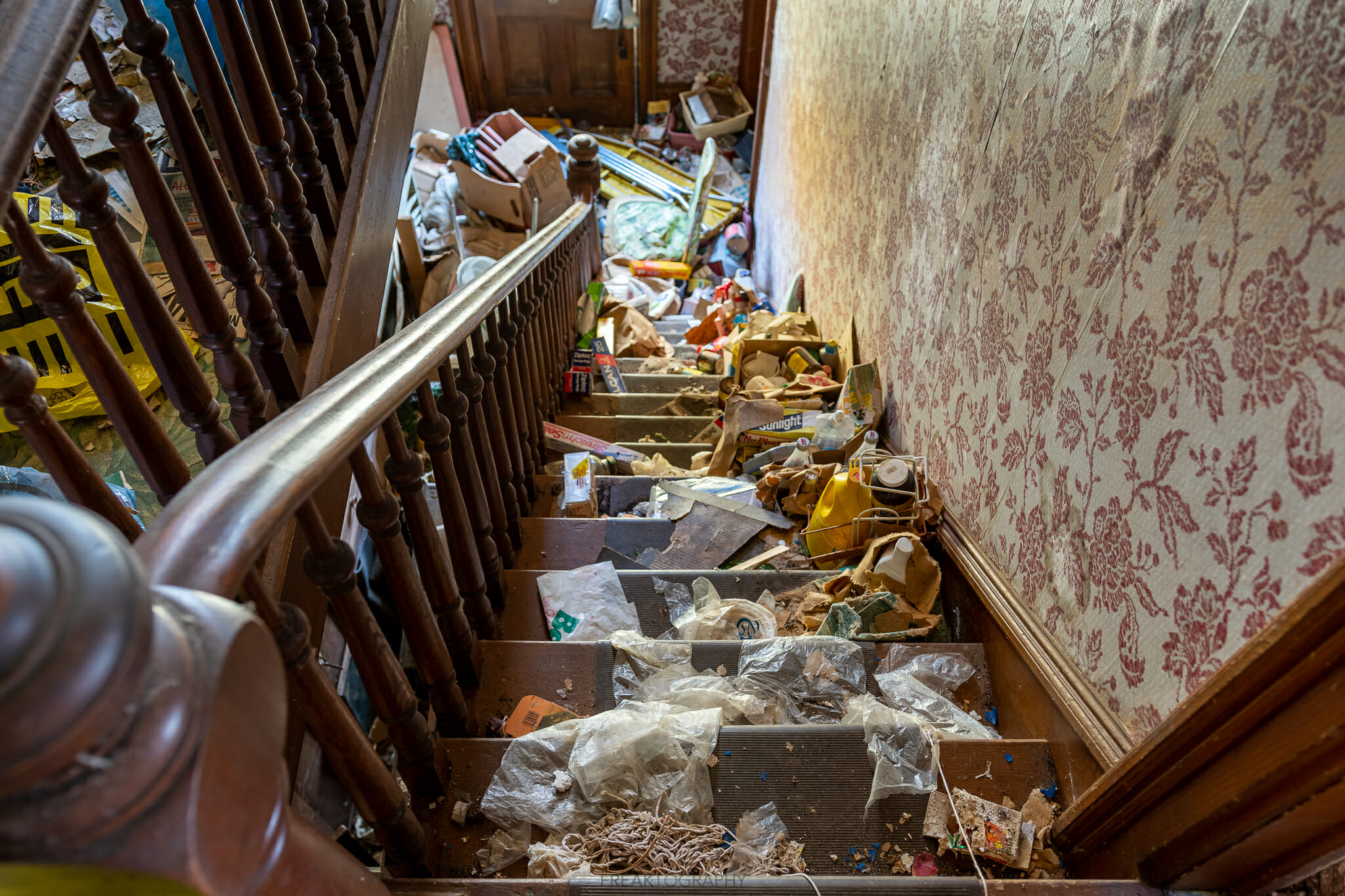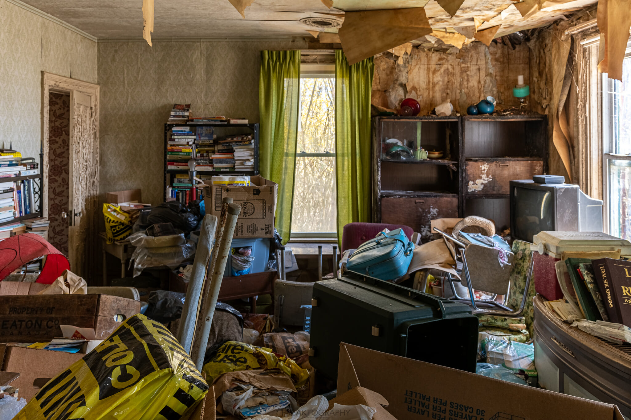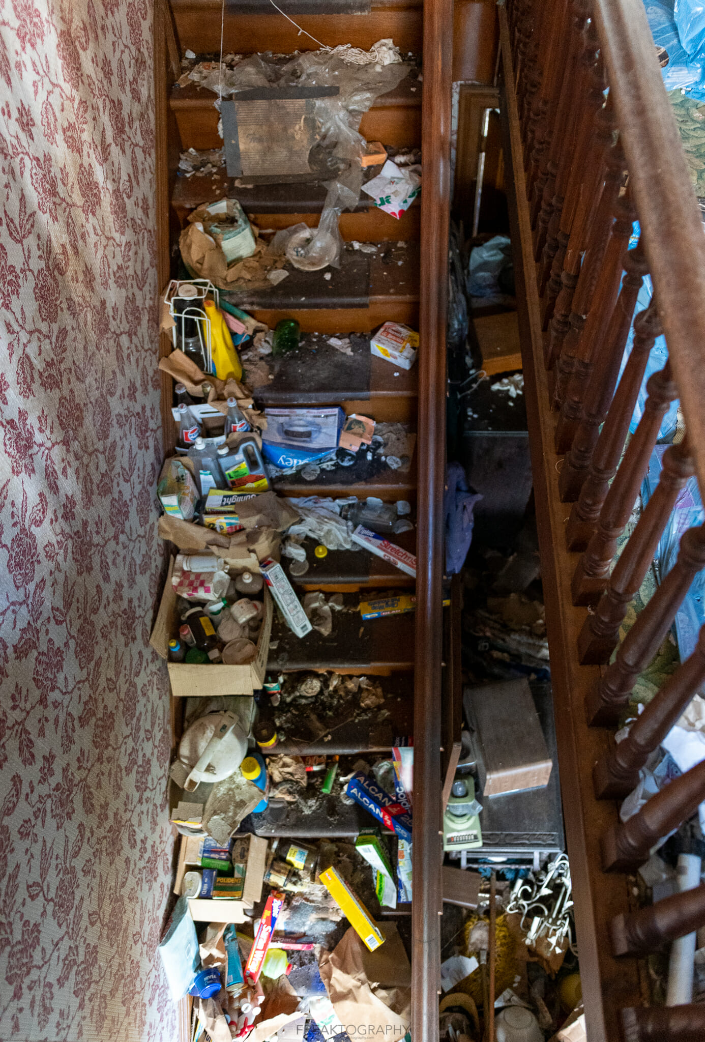 With the neighbour’s dog barking at me aggressively I made my way to the house and found the opened door, stepping inside I nearly tripped on all of the debris. I already know how this is going to go, these types of homes are near impossible to shoot, there is too much stuff, too many piles and it is so hard to navigate from room to room.