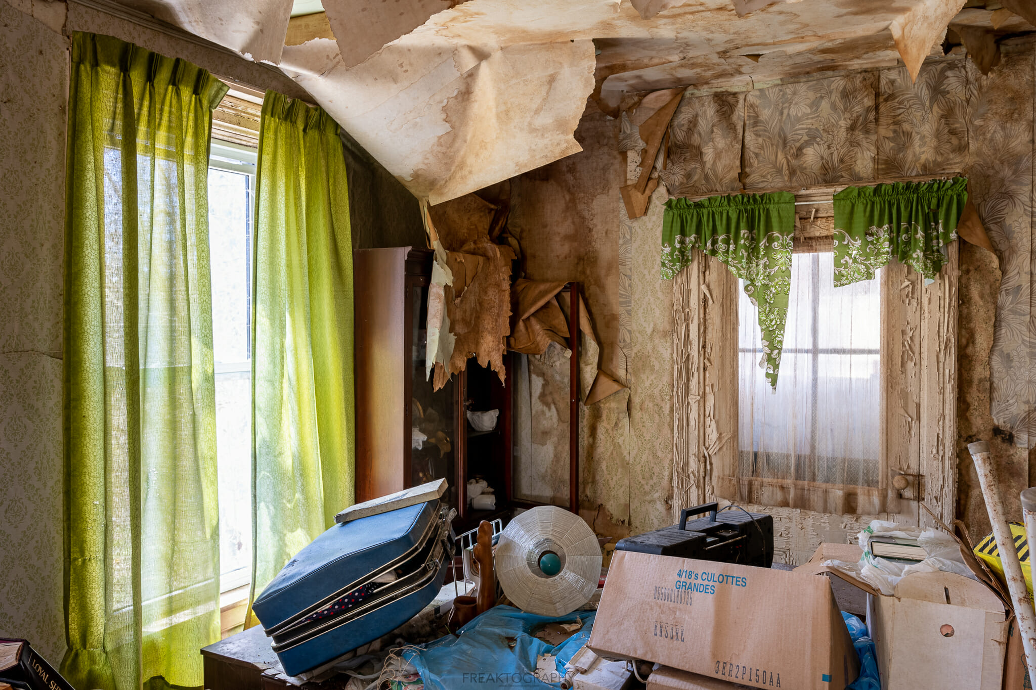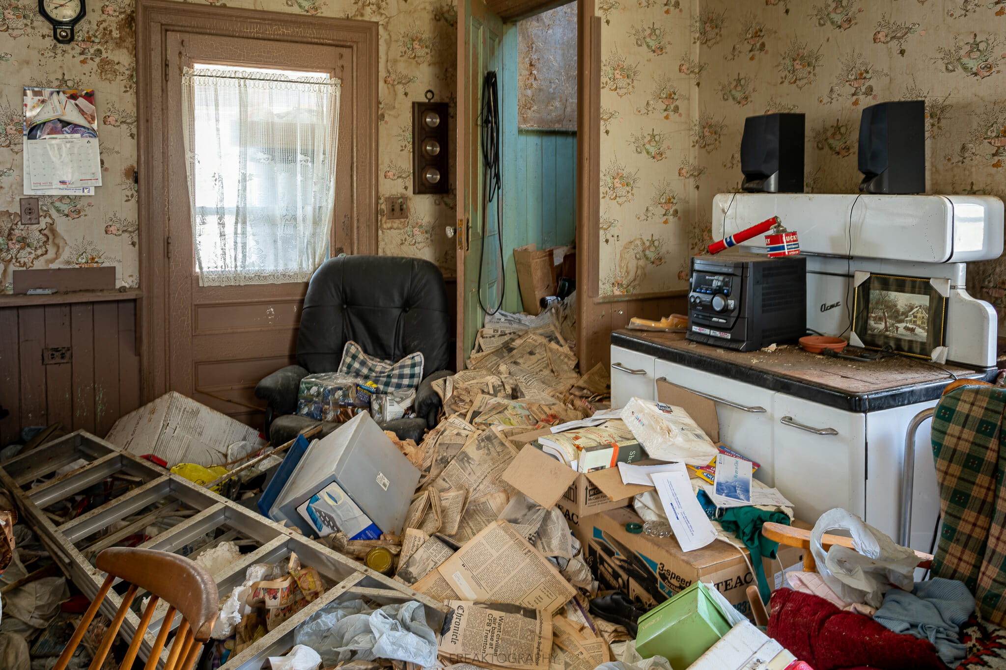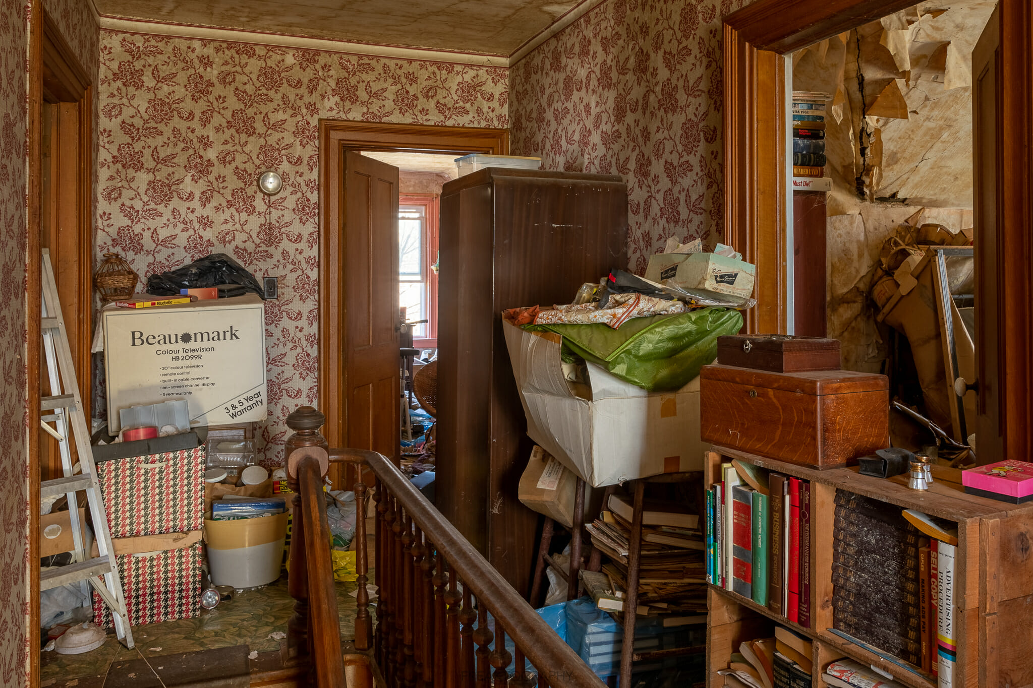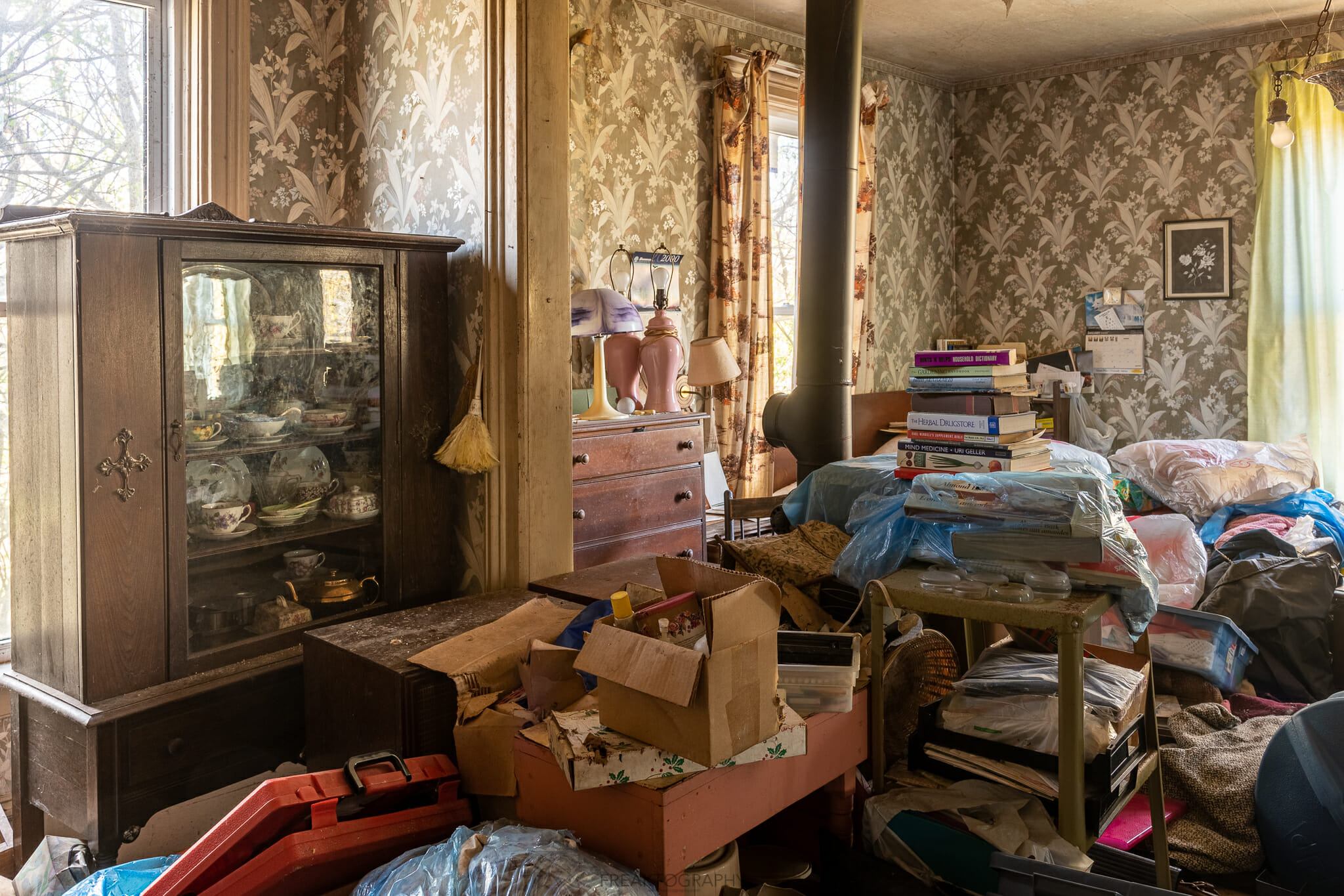 With the neighbour’s dog barking at me aggressively I made my way to the house and found the opened door, stepping inside I nearly tripped on all of the debris. I already know how this is going to go, these types of homes are near impossible to shoot, there is too much stuff, too many piles and it is so hard to navigate from room to room.