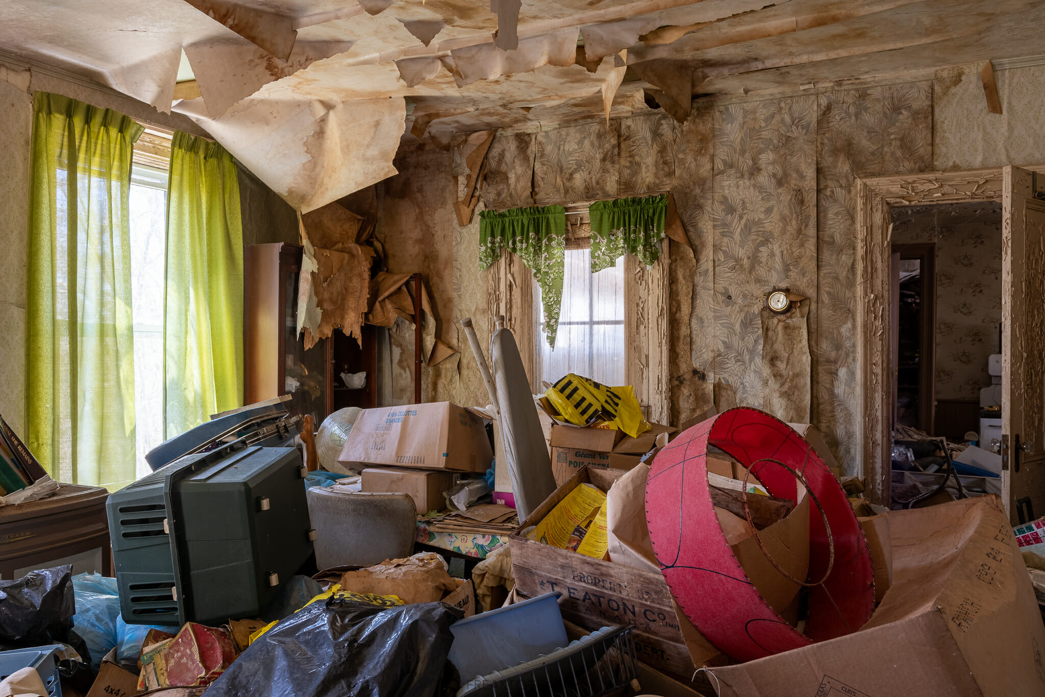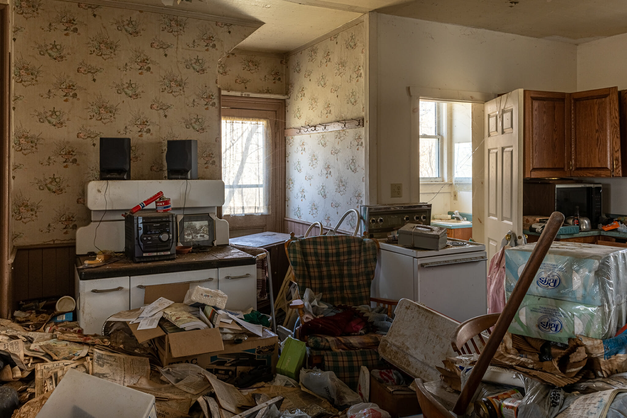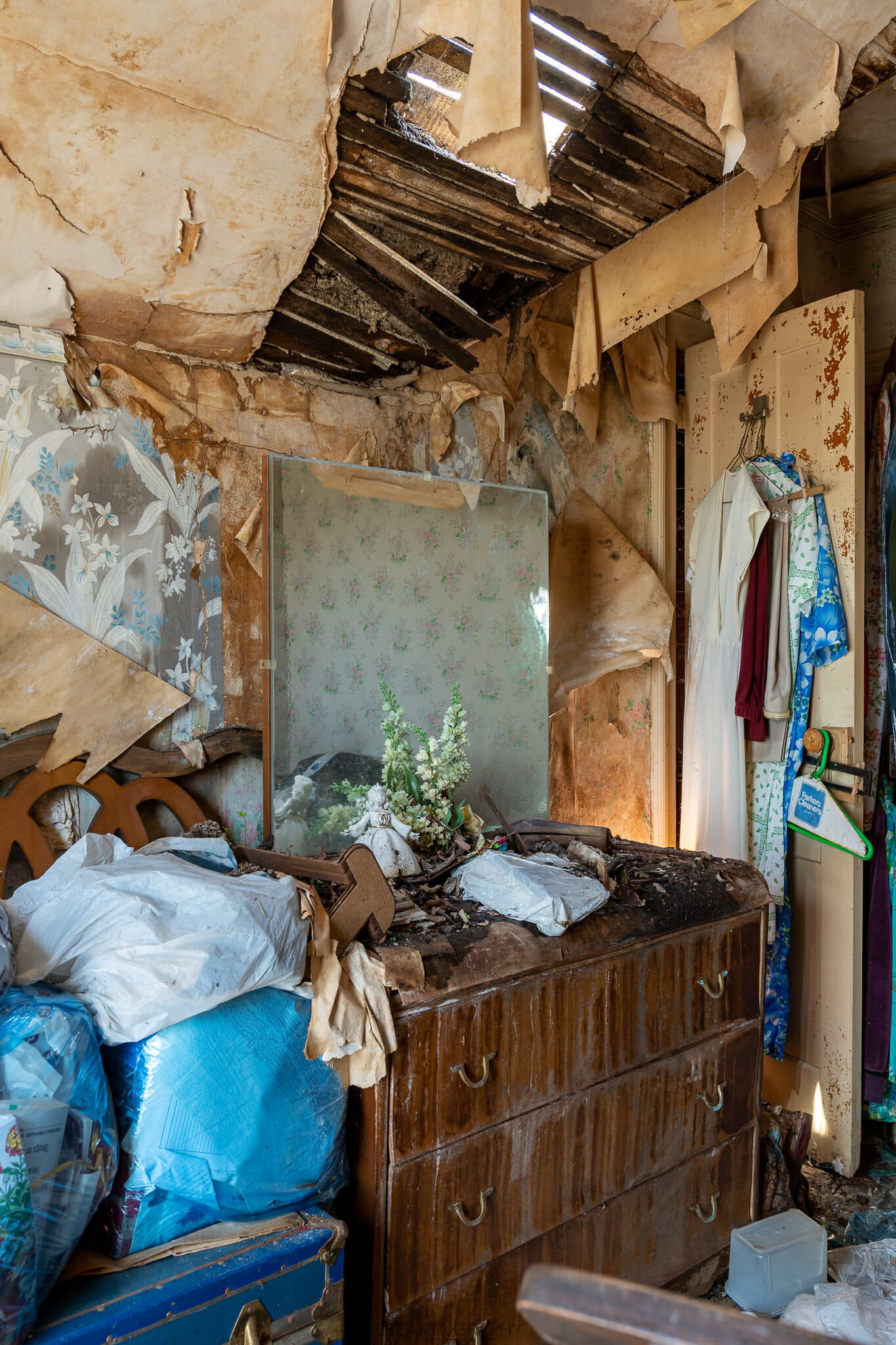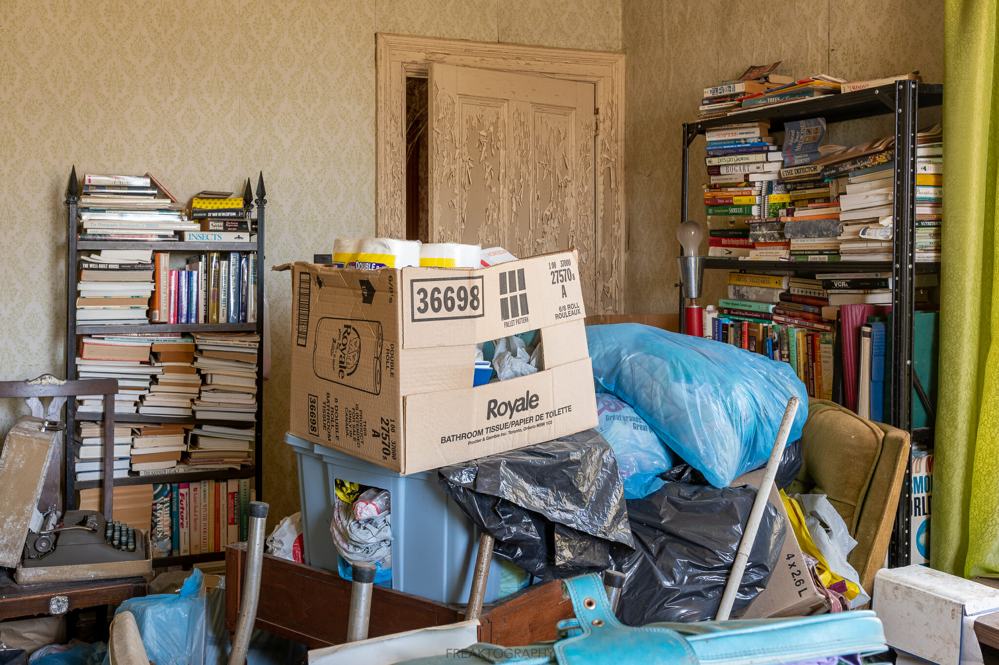 With the neighbour’s dog barking at me aggressively I made my way to the house and found the opened door, stepping inside I nearly tripped on all of the debris. I already know how this is going to go, these types of homes are near impossible to shoot, there is too much stuff, too many piles and it is so hard to navigate from room to room.