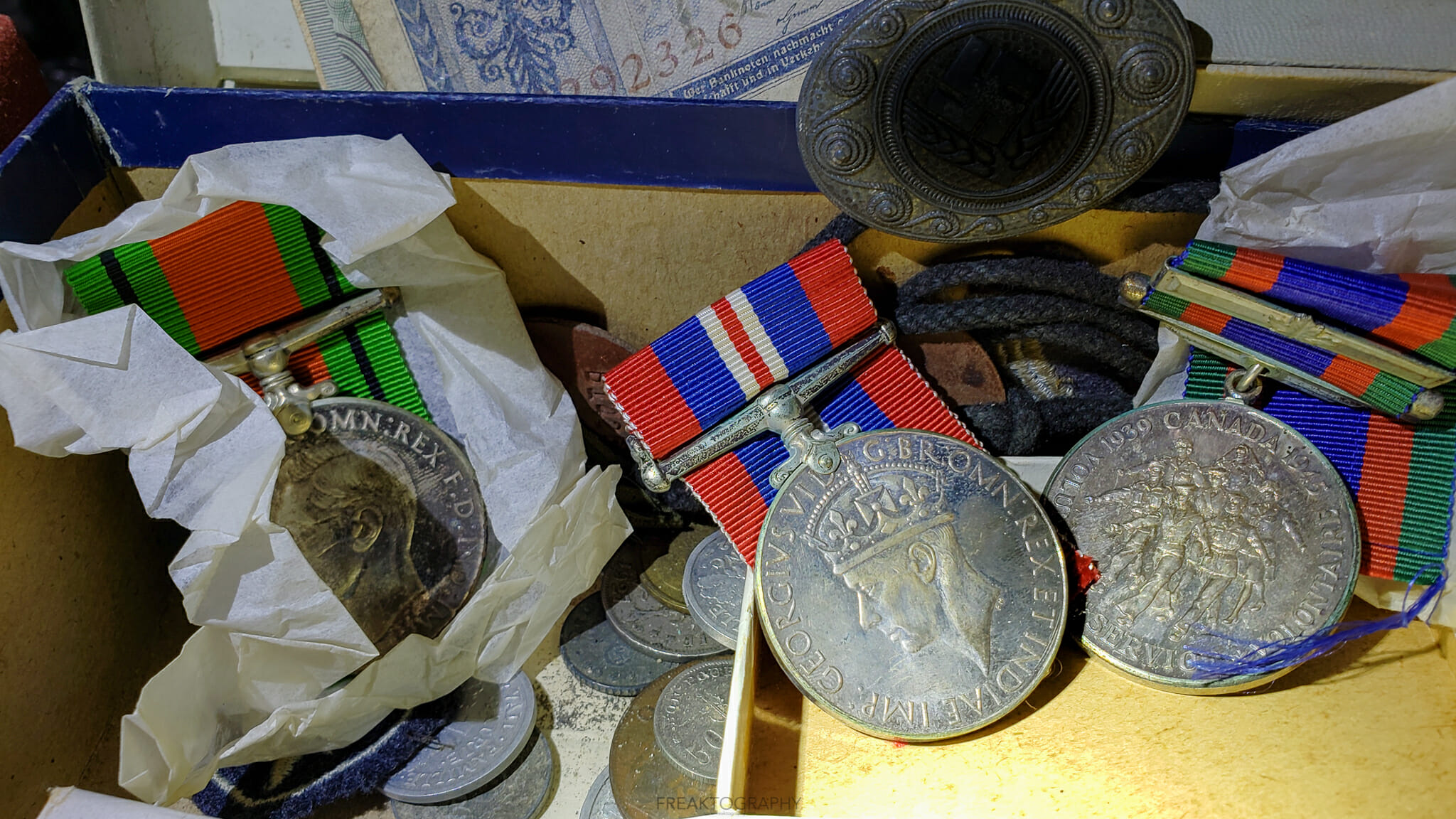 “So, funny story, my mother was pretty upset at the thought of those pieces of history being swallowed up in that house so she went back the next day with my sister to get them, I think in her haste she must have left a box or 2 of the medals but she re wrapped them and has taken good care of them, they have just been sitting on her dresser. She has a premium ancestry.ca account and was positive she could track down the relatives…. ….So now I have the medals and I would love to see them get back to the family, where are you located? Do you want to meet up today?”
