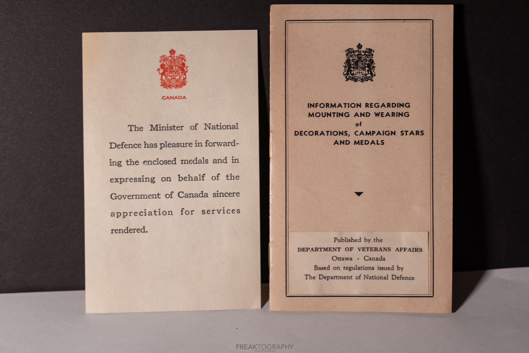 – France and Germany Star  – 1939 – 1945 Star  – War Medal 1939-1945  – The Defence Medal  – Canadian Volunteer Service Medal with Maple Leaf Bar