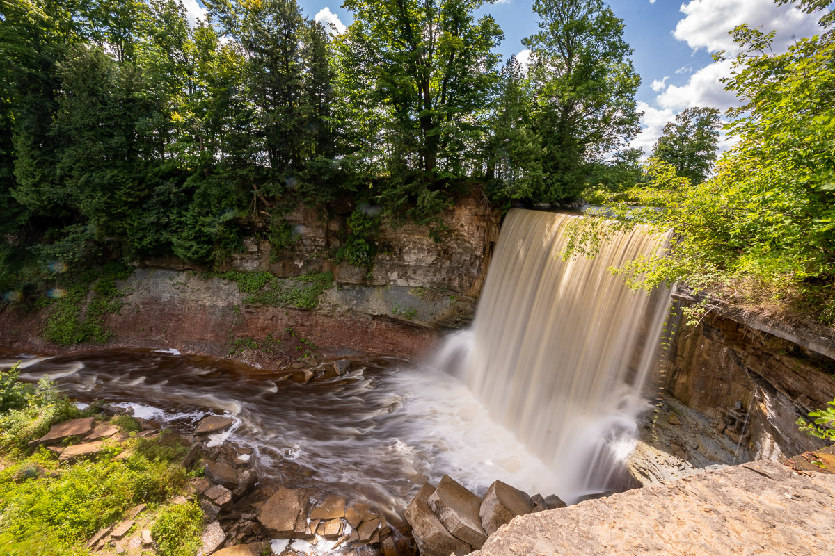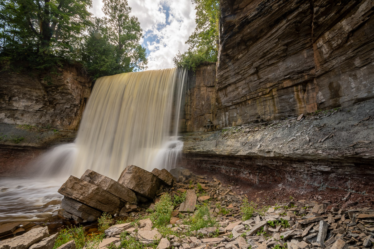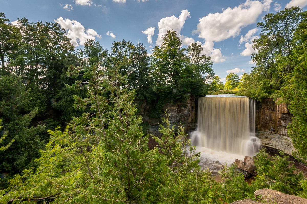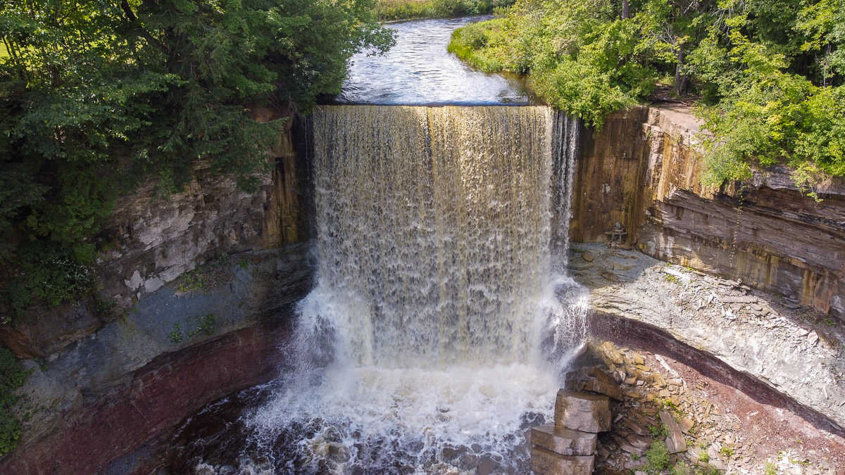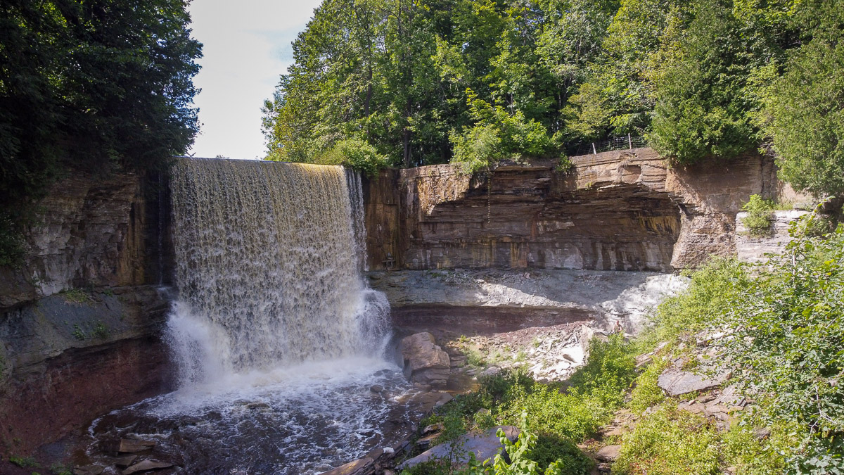 The 15 metre high waterfall was formed by the erosion of soft Queenston shale beneath hard Manitoulin dolomite, in a manner similar to Niagara Falls.