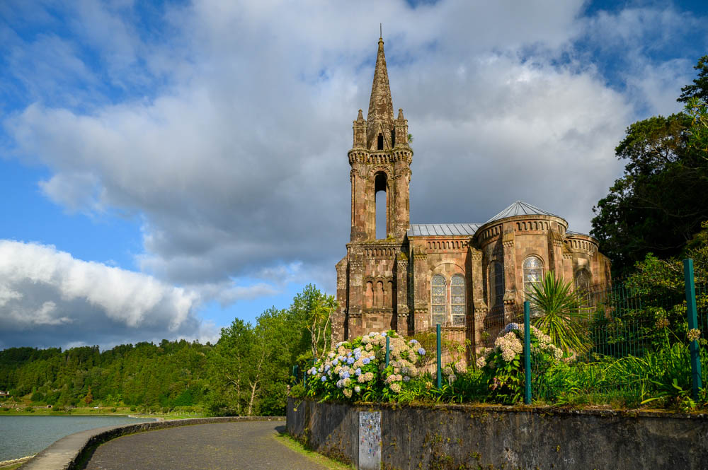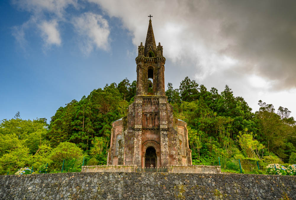 At the edge of Lagoa das Furnas sits Capela de Nossa Senhora das Vitórias, a neo-Gothic chapel that looks abandoned at first glance, but it is not a forgotten parish church. It was built in the late 19th century by José do Canto, a wealthy Azorean landowner and botanist, as a personal tribute to his wife, who died young. Built from local stone in a romantic Gothic style, the chapel blends into the lakeside landscape. José do Canto and his wife are buried inside, giving the building a quiet, intimate weight that feels more like a preserved memory than a ruin.
