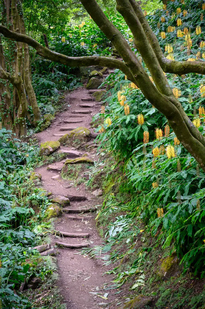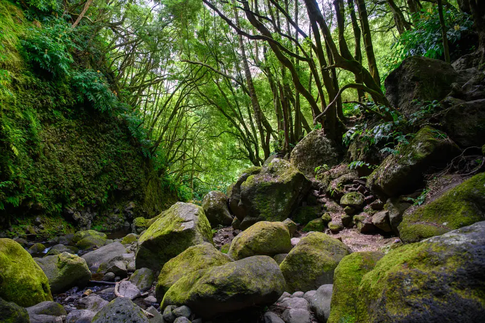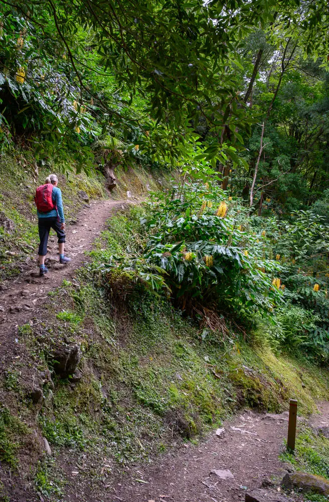 On paper, the route sounds simple. Park near Faial da Terra, hike to the waterfall, continue on the trail to Sanguinho, then return via the steep cobblestone path to the parking area. In real life, it is a demanding walk. The hike starts around 24 metres above sea level and climbs to roughly 230 metres, with long steep grades that can hit 20 to 35 percent. Underfoot, you are dealing with rocks, roots, uneven ground, and constant elevation changes. If you take your time, watch your footing, and treat it like a proper hike instead of a quick stroll, it becomes one of the most rewarding walks you can do on São Miguel.