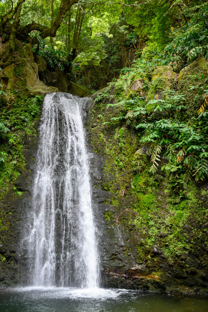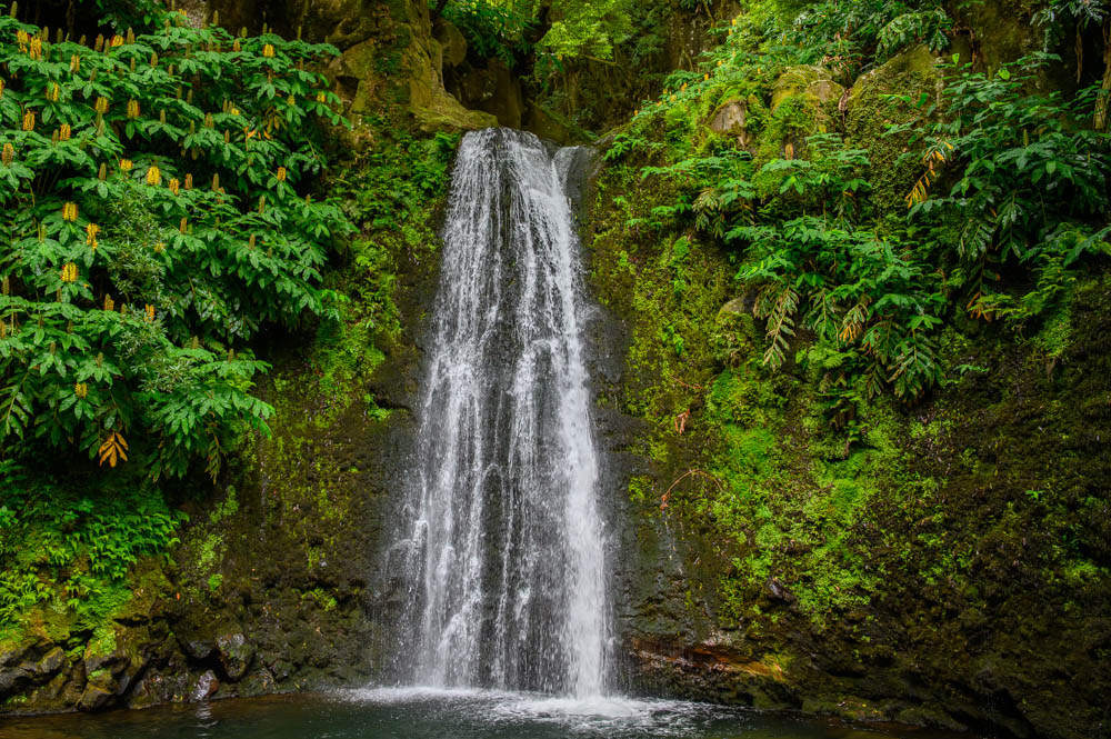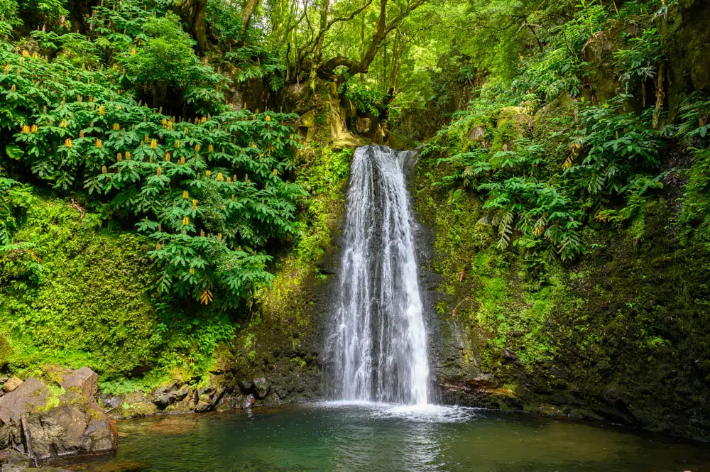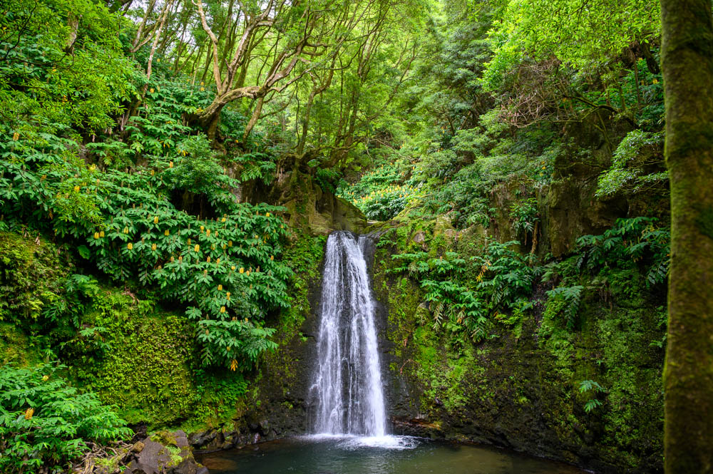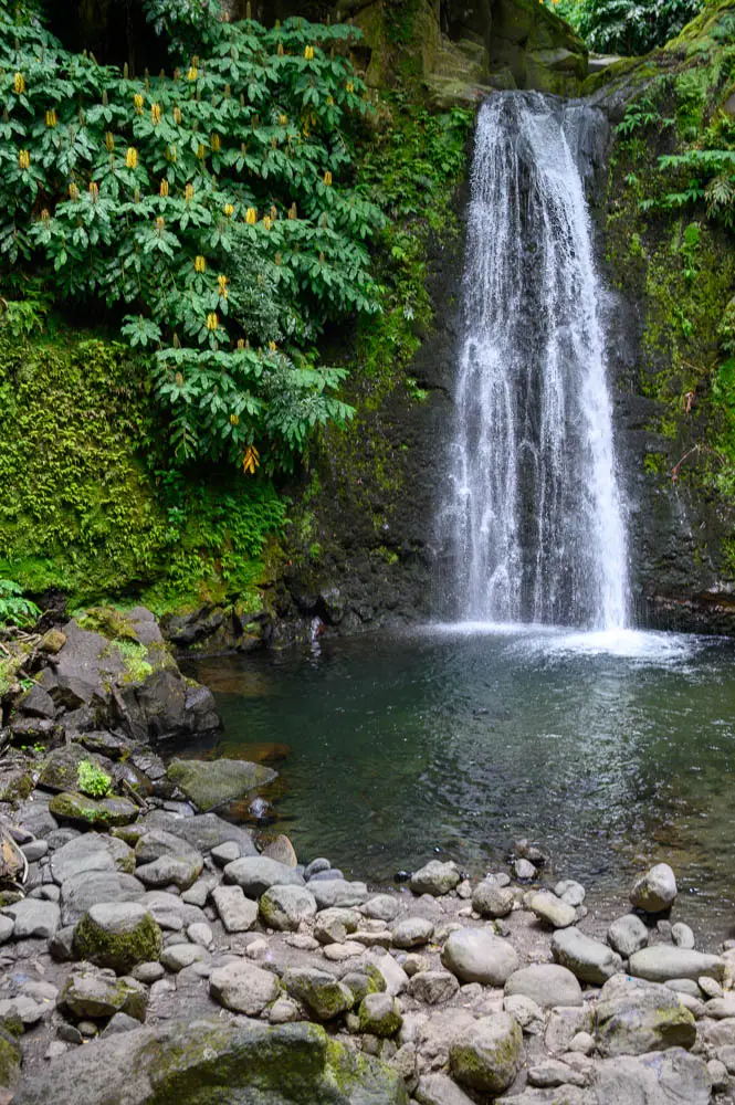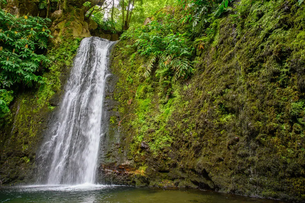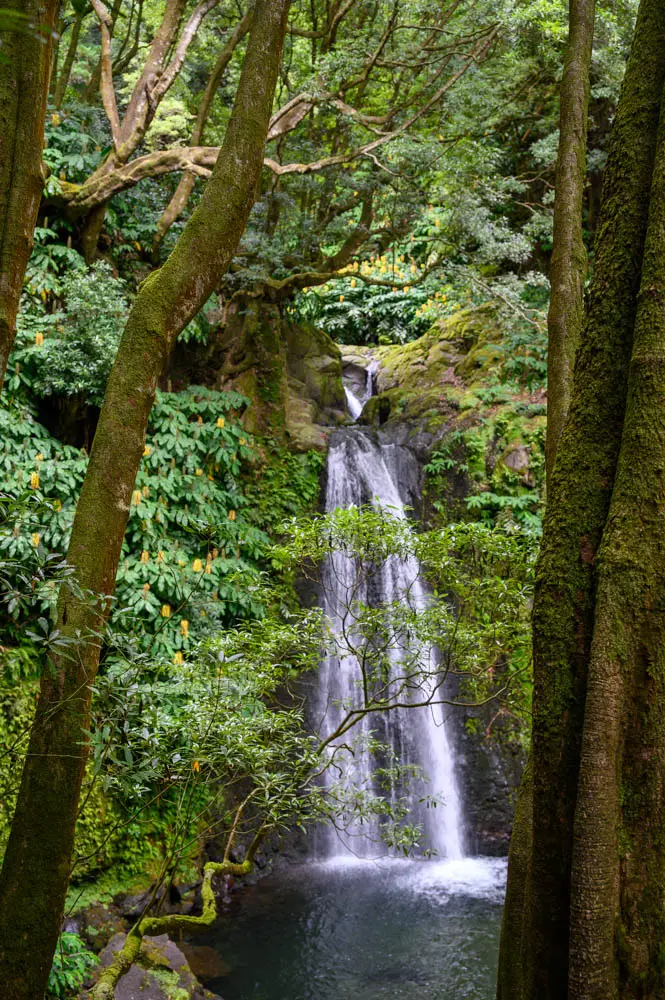 Salto do Prego is a highlight on its own, and it makes a perfect mid-hike reward. When we visited, it was not very busy, and that is likely because you cannot drive to it. You have to hike in, which naturally filters out the crowds. Salto do Prego is one of the most visited waterfalls on São Miguel Island, located in the municipality of Faial da Terra on the southeastern end of the island. Clear water drops from high above into a pool surrounded by dense green walls, and the area is known for its natural landscape. Because access is on foot only, it often feels better preserved than waterfalls you can reach with a short walk from a parking lot.