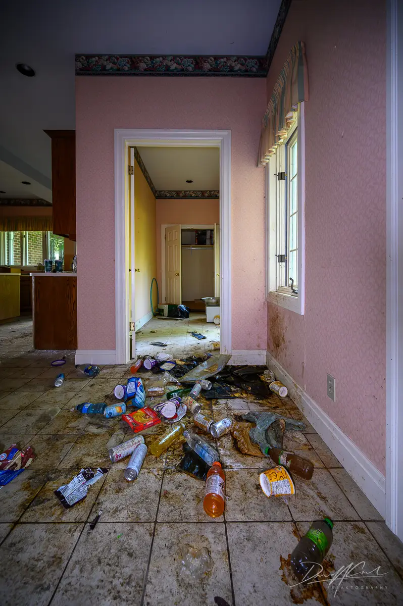 The living room and dining area are empty except for old furniture and scattered items. Walls are peeling, floors are worn, and the ceiling has water damage. These rooms show the size of the house and how it was used for daily life.