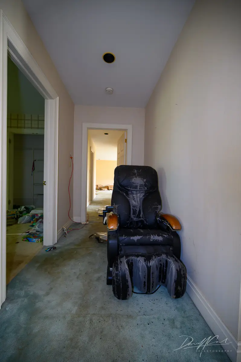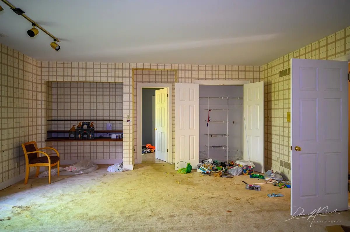 Upstairs, the bedrooms are spacious with large windows. Furniture is left behind, closets are open, and floors are damaged in some areas. Each room shows how the house was divided for family life and daily routines.