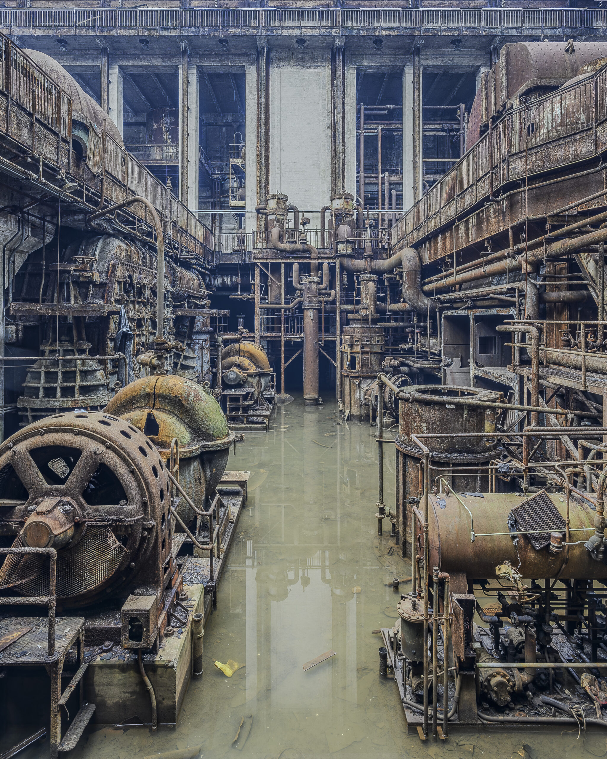 Step inside the haunting remains of the Richmond Power Station in Philadelphia, a massive industrial complex frozen in time. This photograph captures the flooded lower level where rusted turbines and corroded machinery stand silent beneath still water. Once a symbol of innovation and power, the building now tells a different story—one of abandonment, texture, and forgotten history.