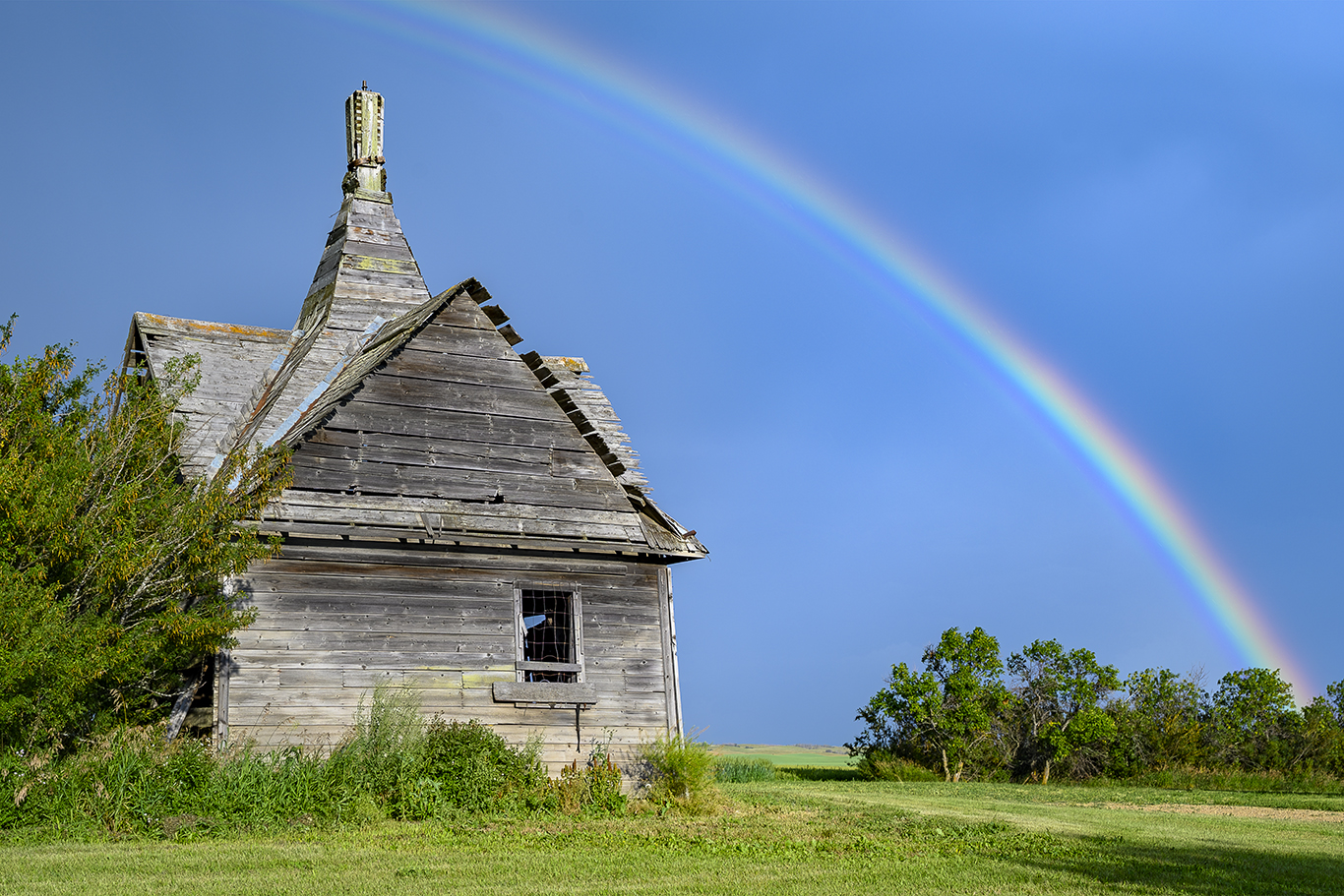 This uplifting photograph features a bright rainbow arching across a prairie sky behind an abandoned wooden house in Alberta. The combination of vibrant color and rural decay creates a balanced and inspiring composition. A beautiful addition for lovers of prairie landscapes and rustic photography.