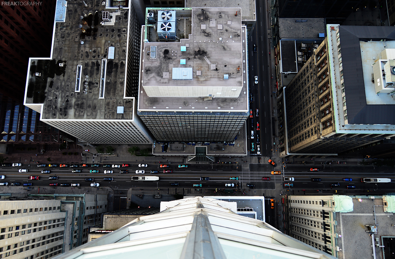 Many of the most popular images taken from rooftoppers are the ones where the camera is pointed straight down, the amazing thing about these photos are that they give the viewer the sensation of vertigo, even though they are only looking at a screen or a printed photo. The feeling/sensation of leaning over the ledge of a roof and looking straight down is one that must be experienced, if you can stomach it – but what I love about these photos is the fact that they can make the viewer actually experience a sensation, just by looking at it.