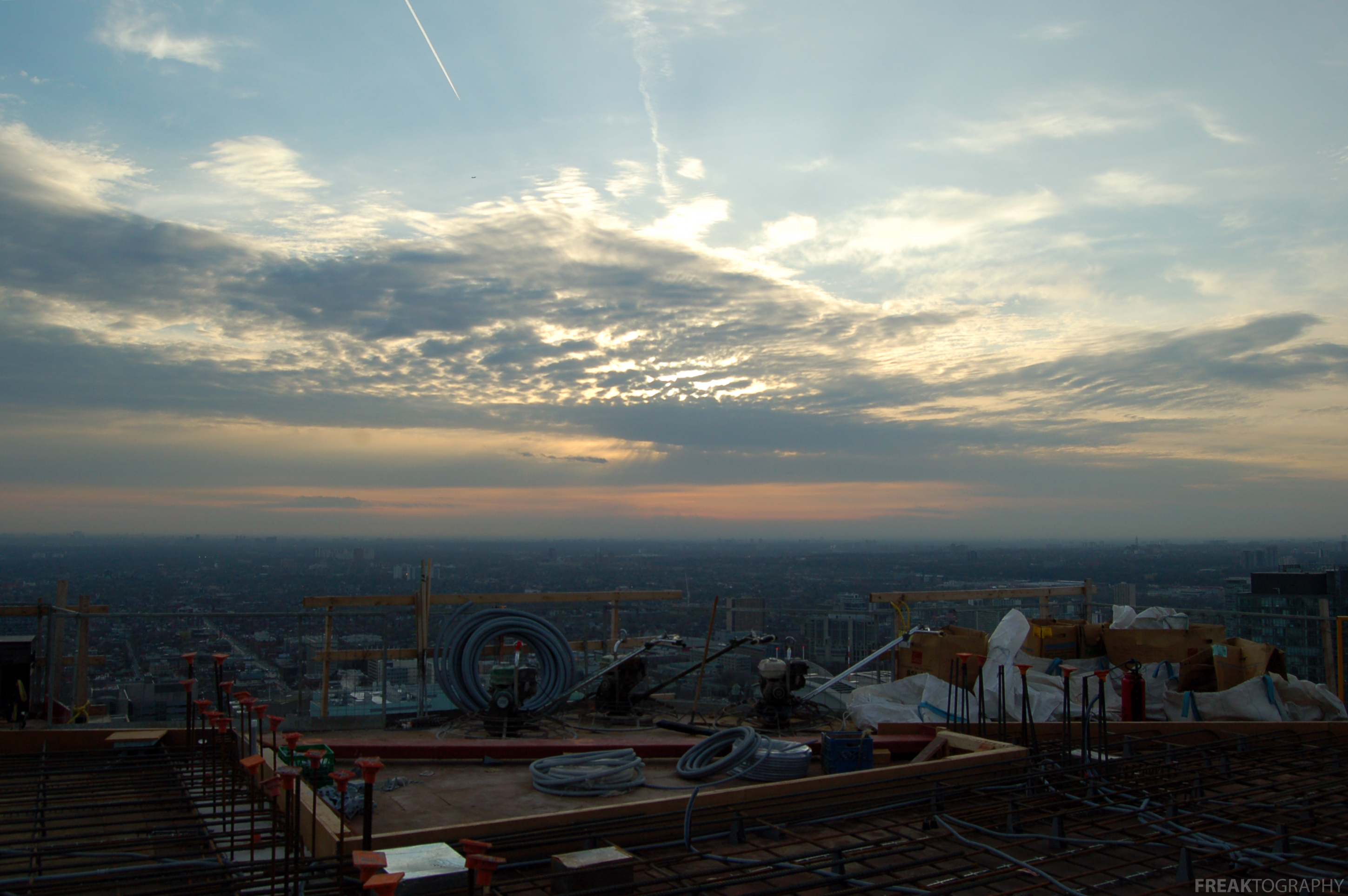 One of the greatest things about standing atop a roof of a skyscraper or the top of a tower under construction is getting there in time to watch the sun set. The city literally changes by the minute, as the sun drops all of the colours change, the sky, the windows, the reflections.