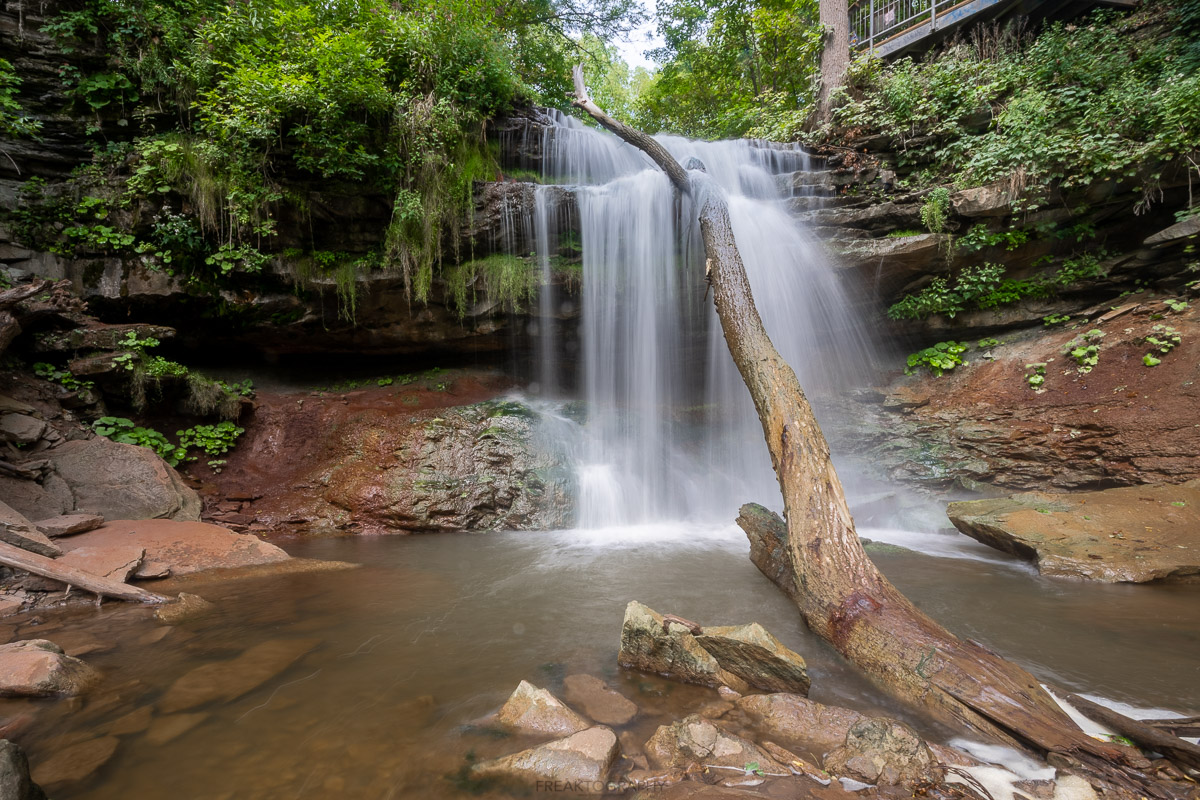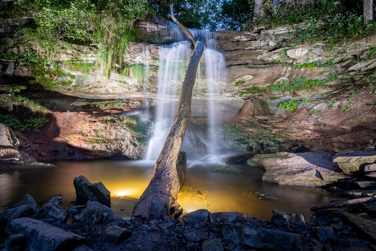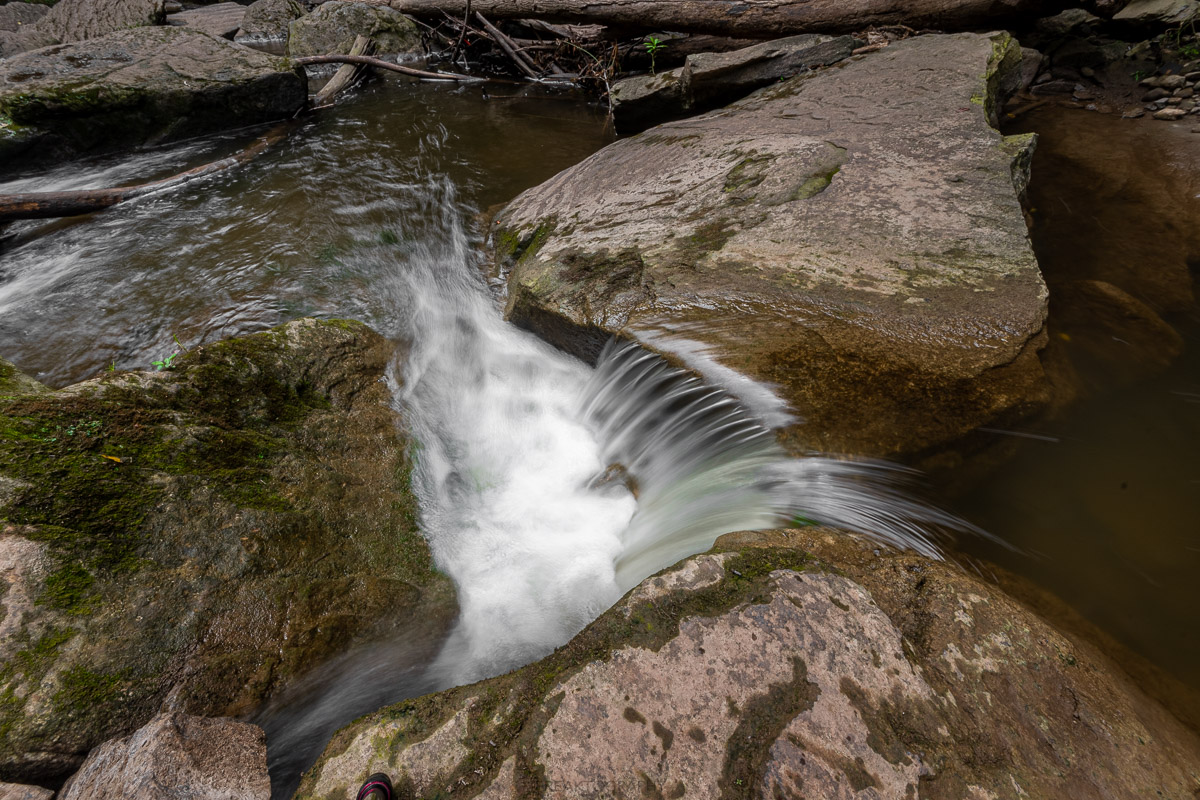 Smokey Hollow Falls, also known as Grindstone Falls, Waterdown Falls or Great Falls is a beautiful ribbon waterfall in a leafy forest setting that flows from Grindstone Creek in Waterdown.