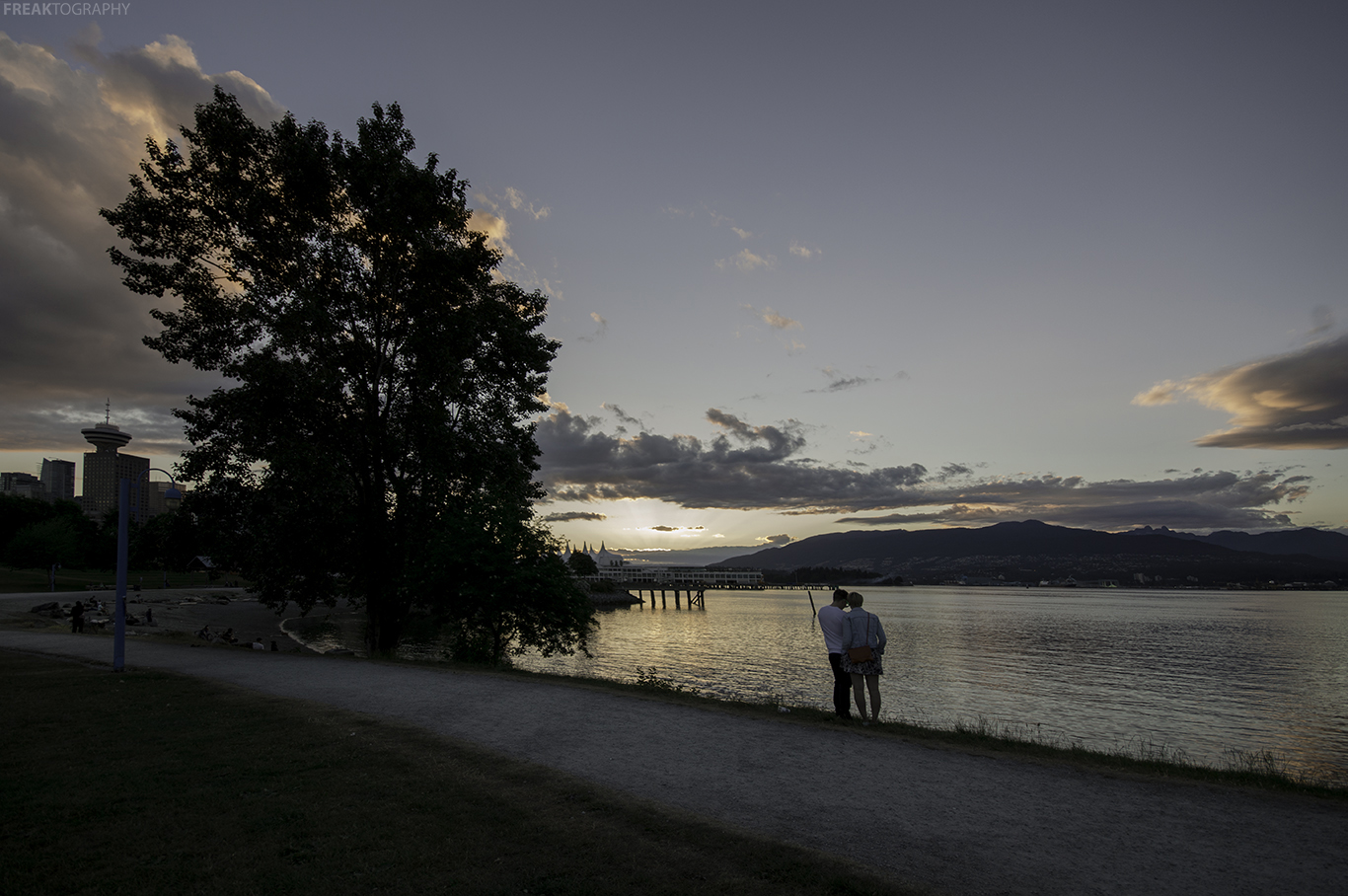 A couple in Vancouver looking through their sunset photos