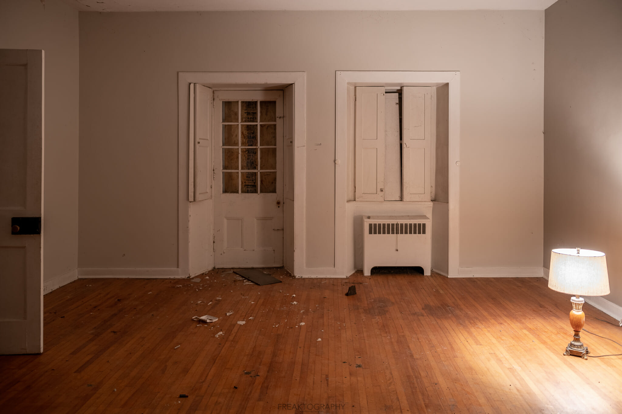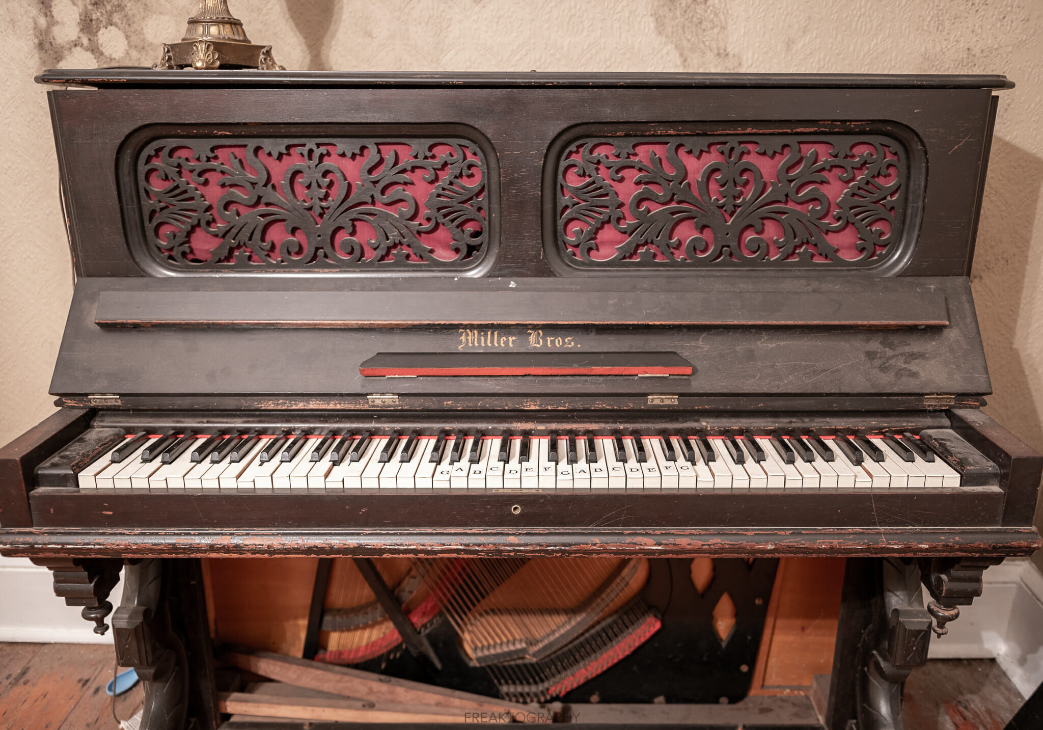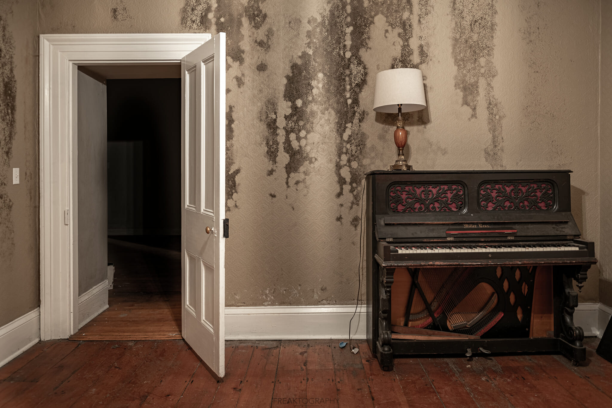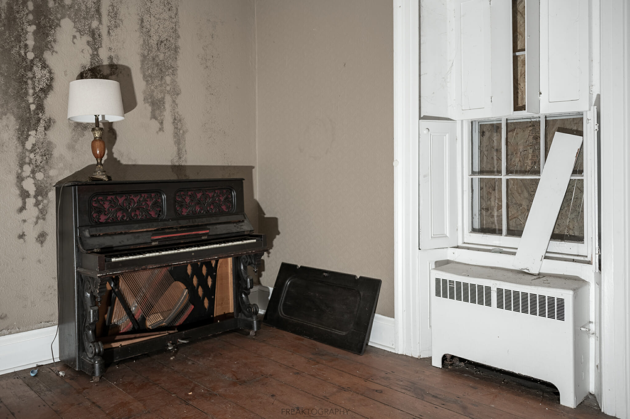 An old piano and lamp at the abandoned woodhill heritage home