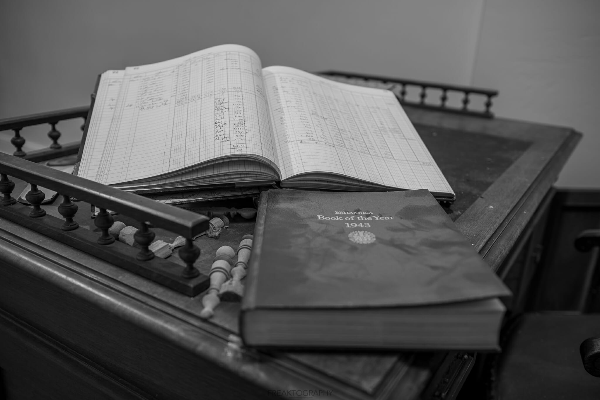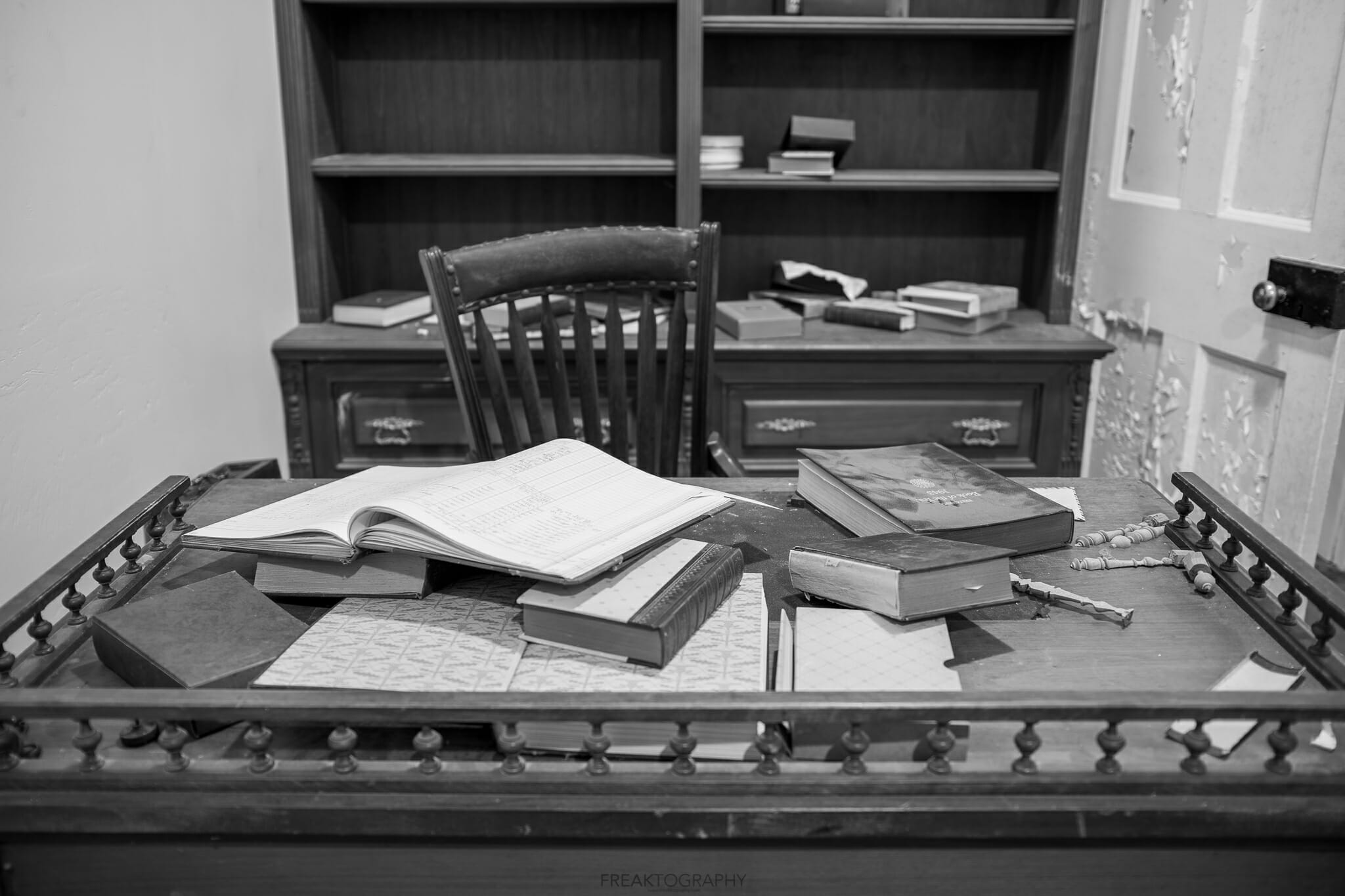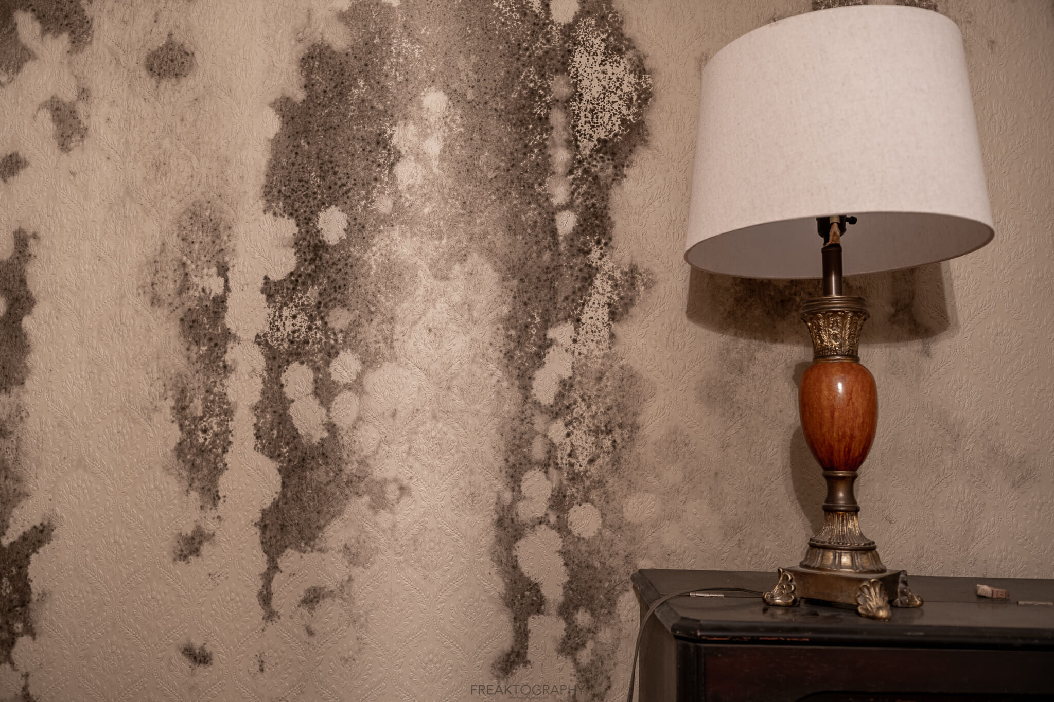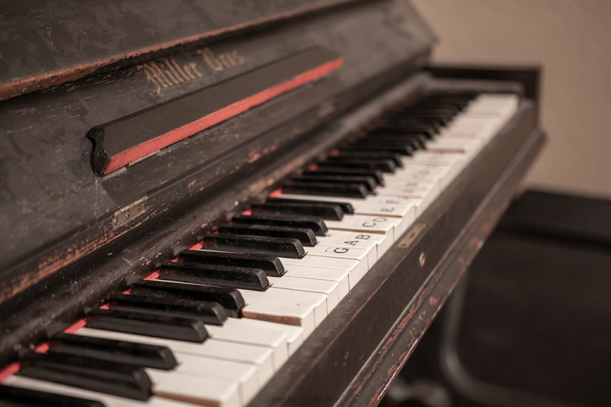 An old piano and lamp at the abandoned woodhill heritage home